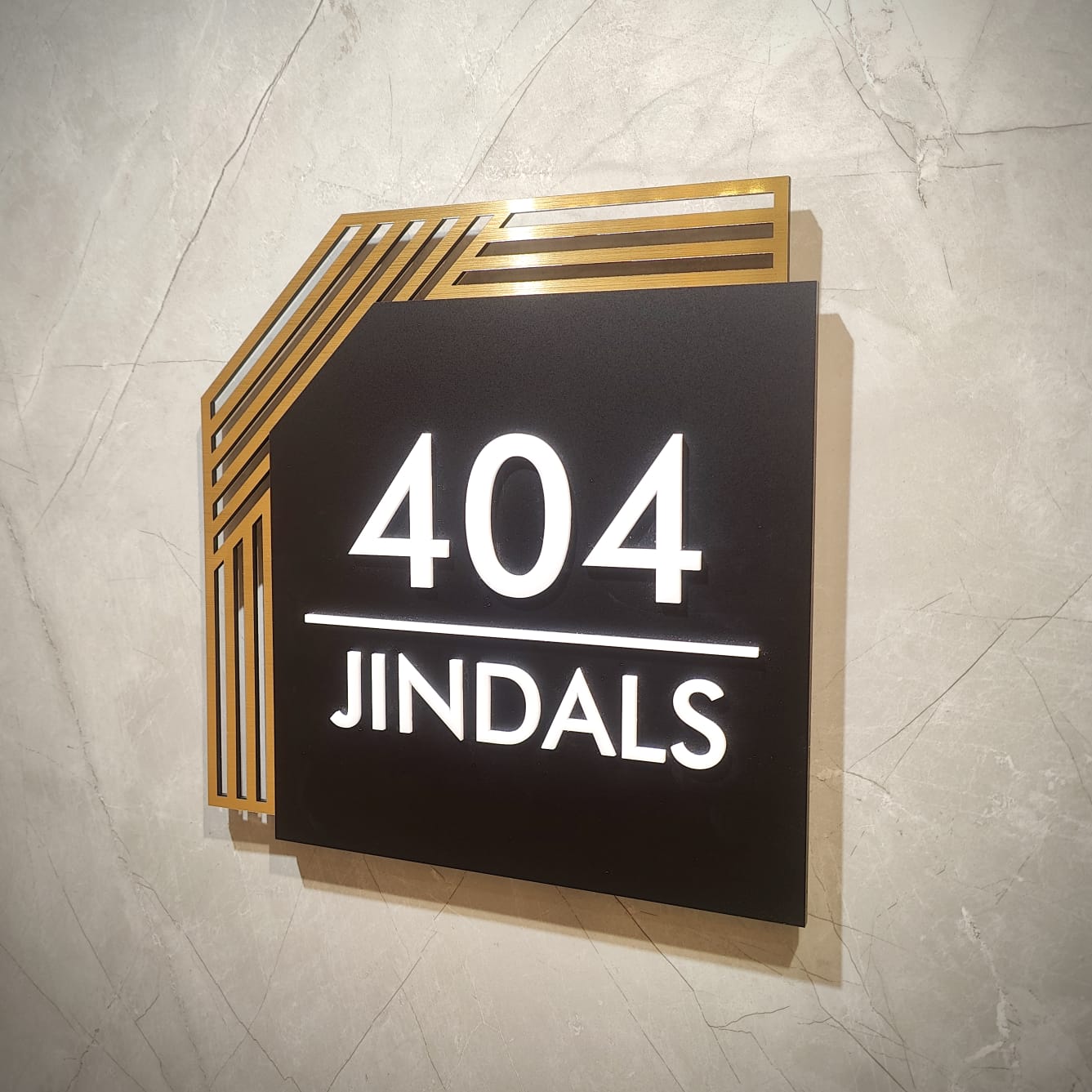 This designer nameplate features a matte black square base that creates a bold, contemporary foundation. Enhancing the design is a metallic finish cutout pattern that subtly extrudes from behind the main plate, adding depth and a distinctive layered effect while maintaining a clean, sophisticated look.